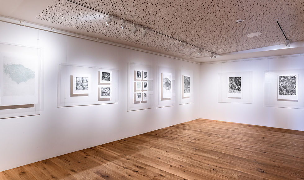 V grafickém kabinetu prezentuje autorka díla (čárový lept, mezzotinta) ze série Dunění skal (2019–2022). Vystavené grafiky představují ve svém precizním zpracování abstraktní formy různých struktur. Nejsou to konkrétní přesné záznamy přírodnin, ale pocity uchované v jejím nitru. Části složené dohromady, kterými Lenka postupně buduje celý svět. Obklopující kamenná krajina připomíná na první pohled prostředí vesmírného tělesa bez známky života. Když se ale do ní vnoříme, alespoň do toho kousíčku země, který nám autorka přináší, cítíme život. Energické ornamenty přírody.